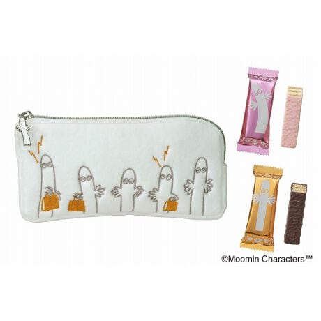 5匹のニョロニョロたちの姿が印象的なポーチはニョロニョロづくし。チャームやポーチの内側の生地、個包装にもニョロニョロをにぎやかにデザインしました。ポーチの裏面にはスナフキンのシルエットをあしらい、どこから見ても楽しいポーチです。中にはココアクリームをサンドしたチョコレートウエハースとホワイトクリームをサンドしたストロベリーウエハースを詰め合わせました。
