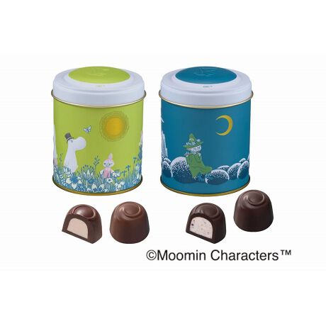 ムーミンたちとムーミン谷の朝と夜の様子を描いた缶ケース。2種類の対照的なムーミン谷の姿とムーミンたちが楽しめます。リンゴンベリーとブルーベリーの2種類のチョコレート入り。