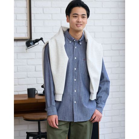[型番:314U1202]シャンブレーのボタンダウン襟シャツです。経糸にスラブ糸を使用し表情のある風合いに仕上げました。製品でバイオ洗い加工を施しており、程よいこなれ感をお楽しみいただけます。
