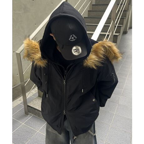 ファー付きフード: ボリューム感のあるファーが無骨なデザインに華やかさをプラス。顔まわりを暖かく包み込み、冬の寒さから守ってくれます。