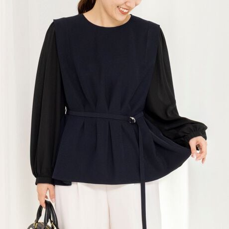 ・衿ぐり、袖口、裾と配色でトリミングし、レイヤードしているようなデザイン性のあるブラウス