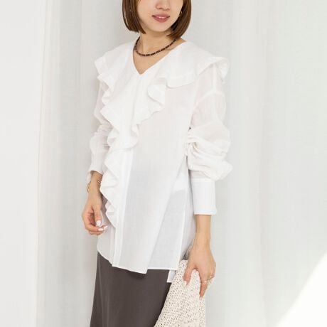 ・ラッフル端にフリル布を付けた立体感のあるボリューム襟が、新鮮なアクセントのブラウス