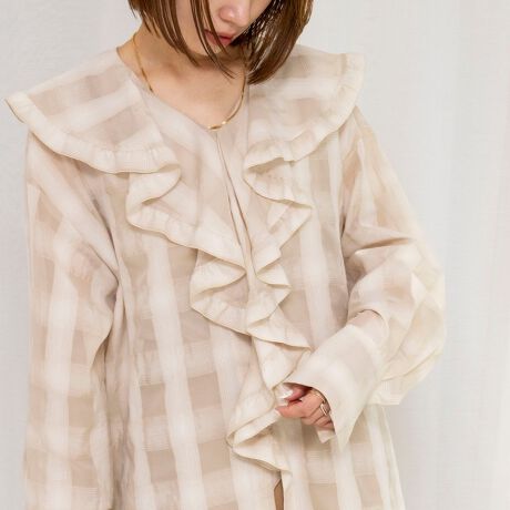 ・ラッフル端にフリル布を付けた立体感のあるボリューム襟が、新鮮なアクセントのブラウス