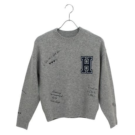 左胸にエンブレムワッペン、所々に刺繍を施したこなれ感あるニット。ドロップショルダーにカレッジ風のデザインが程よいカジュアル感のあるニット。程よい肉感、洗えるというイージーケアも嬉しい。