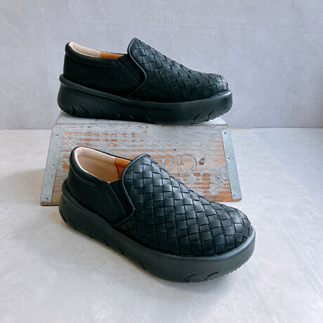 編み込みデザインが上品で、シンプルながら存在感のある厚底スリッポン。