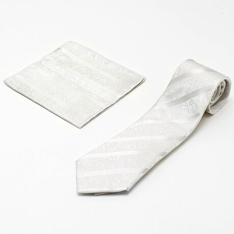 繊細なペイズリー柄をストライプ調に織り上げた、アクアスキュータムのフォーマルタイ。遠目には端正なストライプ、近くで見ると優雅なペイズリーが浮かび上がる奥行きのあるデザインが、胸元にさりげない華やかさと品格を添えます。同柄のポケットチーフ付きで、コーディネートに統一感と完成度をプラス。結婚式や式典、格式あるビジネスシーンまで幅広く対応し、清潔感・信頼感・上質感を自然に演出できる一本です。