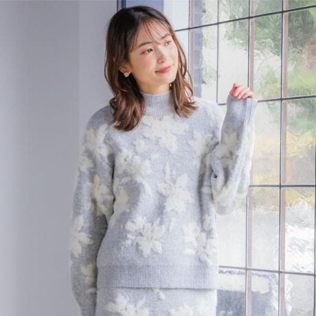 フェザーヤーンで表現したふわふわの花柄が可愛いジャカードニット。