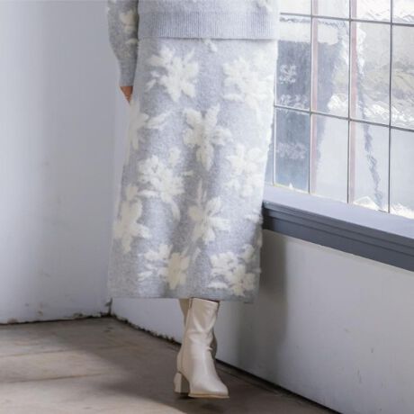 フェザーヤーンで表現したふわふわの花柄が可愛いジャカードニットスカート。