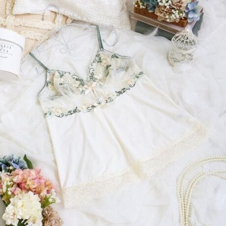 オオデマリのお花をモチーフにした、可憐で華やかなシリーズです。レース一面にあしらったお花の刺繍は、それぞれ異なるステッチでほどこすことで、華やかさの中にも抜け感を演出。バスト部分にはさりげなく小花のアップリケを重ねて、より奥行き感のあるデザインに仕上がりました。葉っぱのスカラは同系色の交互カラーで可愛らしさを出しながらも、思わず目を引くインパクトをプラス。バスト下とバックスタイルにはカットホールをあしらい、小さなリボンを添えて、キャミソールだけの特別感をお楽しみいただけます。キラキラときらめくラメ糸と、リサマリらしいカラーリングをミックスした、女の子の心ときめくコレクションです。