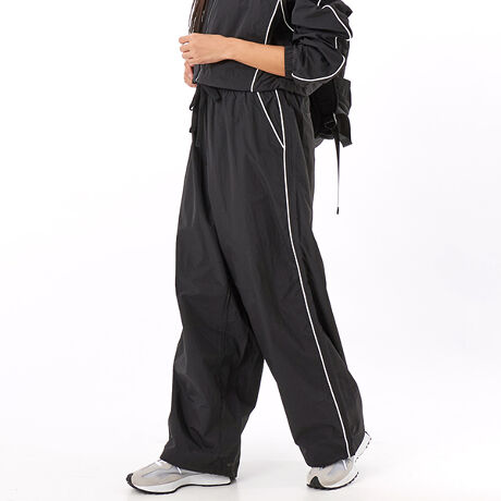 スポーツミックスに効果を発揮するウーブントラックパンツ。ナイロン素材ならではの光沢とたっぷりのワイドシルエットが、スタイリッシュなコーディネートを完成させます。ヒップポケットにはバッジロゴのアクセントをプラス。また、サイドシームに施されたパイピングが縦を強調し、脚長バランスを演出します。