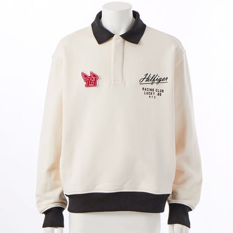 スポーティなラグビーカラーを採用したトレーナー。両胸にキャッチーなロゴをあしらい、衿・裾・袖口はコントラストカラーで切り替えています。裏起毛素材を使用しているため、外気を通しにくく、ふっくらとした暖かな着心地。前立ては比翼ボタン、斜めに入れたサイドシームにはポケットを備えています。