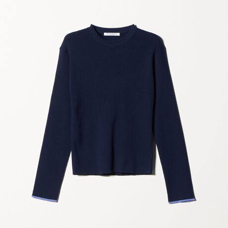 ややコンパクトなサイズ感のクルーネックニットプルオーバー。