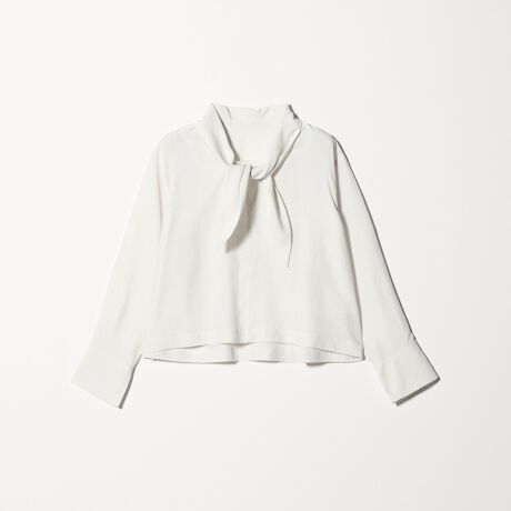 スカーフを首に巻いたような表情の出るクラシカルなボウタイブラウス。
