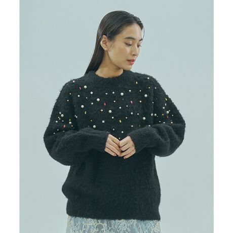 胸元にたっぷりとビジューがあしらわれており、1枚で華やかな印象になるニットです。