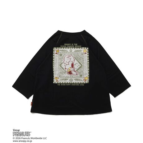 オリジナルのバンダナ風の柄にスヌーピー、チャーリー・ブラウン、ウッドストックを刺繍で表現。