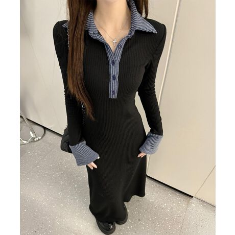 配色デザインが目を惹くリブニットのポロ衿ロングワンピース。