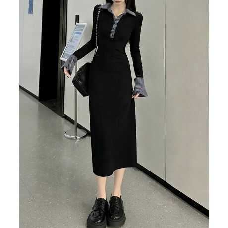 配色デザインが目を惹くリブニットのポロ衿ロングワンピース。