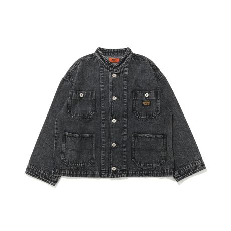 カバーオール風のデザインに、首元がすっきり見えるバンドカラーを合わせた旬の1枚です。