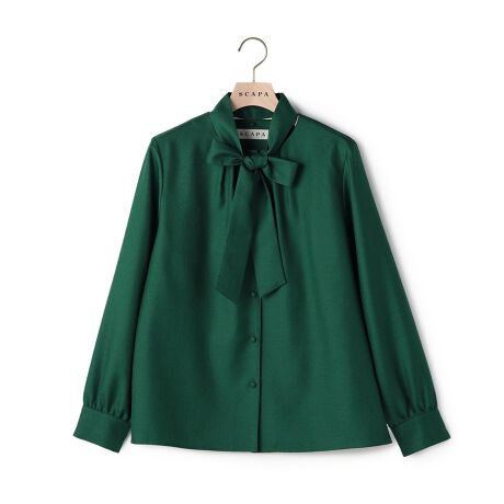 取り外し可能なボウタイリボン付きの長袖ブラウス。ボウタイを外すとノーカーラーのすっきりとしたデザインになり、異なる2つの雰囲気の着こなしを楽しめるアイテム。フロントのコロンとしたくるみボタンもデザインポイント。お出かけにはもちろん、フォーマルなシーンにも映えるエレガントな一枚です。