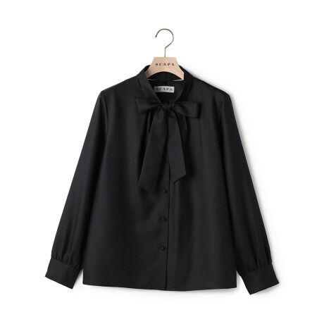 [型番:72262270151]取り外し可能なボウタイリボン付きの長袖ブラウス。ボウタイを外すとノーカーラーのすっきりとしたデザインになり、異なる2つの雰囲気の着こなしを楽しめるアイテム。フロントのコロンとしたくるみボタンもデザインポイント。お出かけにはもちろん、フォーマルなシーンにも映えるエレガントな一枚です。※商品画像はサンプルを使用しているため、実際の商品と色味などの仕様が異なる場合がございます。予めご了承ください。