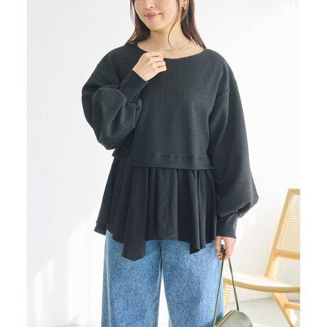 ツイード風のカットソー生地と、柔らかな別布を組み合わせたドッキングプルオーバー。