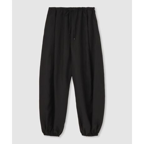 裾にゴムを入れ、自然にたまるフォルムがポイントです。ウエストにはタックとギャザーを施し、立体感のあるボリュームシルエットを演出しています。