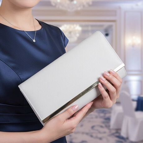 結婚式やパーティー、格式あるお呼ばれの席に華を添える、フェイクレザーのクラッチバッグです。