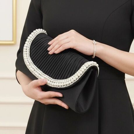 上品なサテン生地の光沢と、バッグの縁にあしらわれたパールが、手元を優しく、華やかに彩ります。