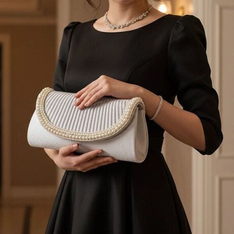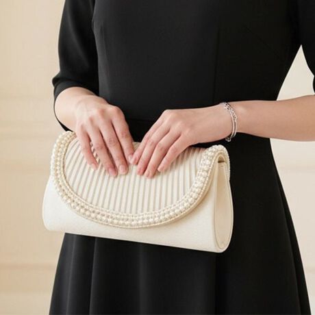 上品なサテン生地の光沢と、バッグの縁にあしらわれたパールが、手元を優しく、華やかに彩ります。