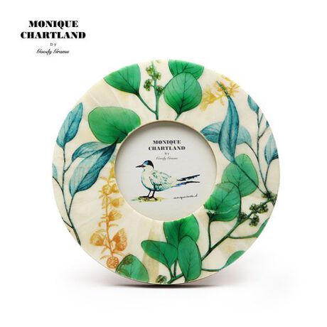動物の骨でできたフレームに様々な植物がプリントされた丸形の写真たて。昇華転写という技術を使用し、絵具の濃淡まで忠実に表現しています。「BOTANICAL 02(ボタニカル02)」はグリーンの葉っぱをメインに、ブルーやイエローで色付けられた爽やかな配色で大人の女性におすすめなデザインです。背面にはスタンドとDリングが付いているので、置き型と壁掛け両方の使い方が可能です。