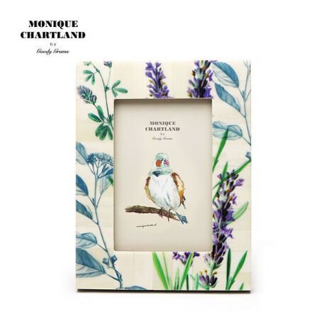 動物の骨でできたフレームに爽やかな野の花がプリントされた写真たて。昇華転写という技術を使用し、絵具の濃淡まで忠実に表現しています。「BOTANICAL 01(ボタニカル01)」は紫の花をメインに、ブルーやグリーンで色付けられた上品な配色で大人の女性におすすめなデザインです。背面にはスタンドとDリングが付いているので、置き型と壁掛け両方の使い方が可能です。