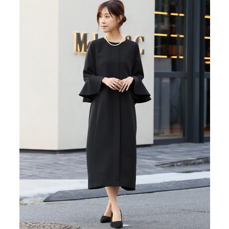 【喪服・礼服】3WAYリボン付き フレアスリーブ 長袖 Iライン ロング丈 ワンピース【洗える】