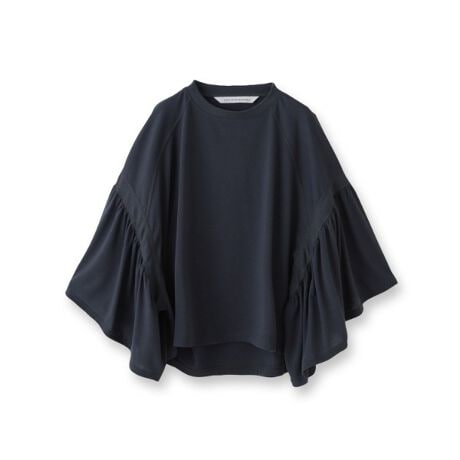 直線的なボディに、大きな四角い布をギャザーで寄せて縫い付けた構築的なデザインが、意外性のあるフェミニンなシルエットを生み出します。