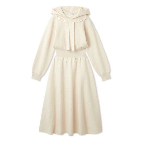 プレーティングによって生まれる程よいハリと、もちっとした弾力を持つ上質な編地で仕立てた、フード付きのフィット&フレアーワンピース。軽やかな着心地ながら、シルエットは美しく構築的で、さりげない存在感を放ちます。カジュアルな印象になりがちなフードデザインも、グログランリボンの艶感やメタルのコードエンド、オリジナルのチャームの繊細なきらめきが、エレガントなアクセントに。衿ぐりのリボン使いや、リンキング部分に施された振りミシンなど、細部にまでこだわった仕様が全体を上品に引き立てます。旅先や週末のお出かけなど、リラックスしたシーンでも“きちんと感”を大切にしたい女性に寄り添う一着。動きやすさと女性らしさを兼ね備えた、CELFORDならではの上品な佇まいが魅力の一枚です。
