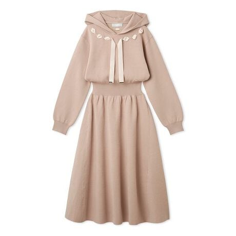 プレーティングによって生まれる程よいハリと、もちっとした弾力を持つ上質な編地で仕立てた、フード付きのフィット&フレアーワンピース。軽やかな着心地ながら、シルエットは美しく構築的で、さりげない存在感を放ちます。カジュアルな印象になりがちなフードデザインも、グログランリボンの艶感やメタルのコードエンド、オリジナルのチャームの繊細なきらめきが、エレガントなアクセントに。衿ぐりのリボン使いや、リンキング部分に施された振りミシンなど、細部にまでこだわった仕様が全体を上品に引き立てます。旅先や週末のお出かけなど、リラックスしたシーンでも“きちんと感”を大切にしたい女性に寄り添う一着。動きやすさと女性らしさを兼ね備えた、CELFORDならではの上品な佇まいが魅力の一枚です。