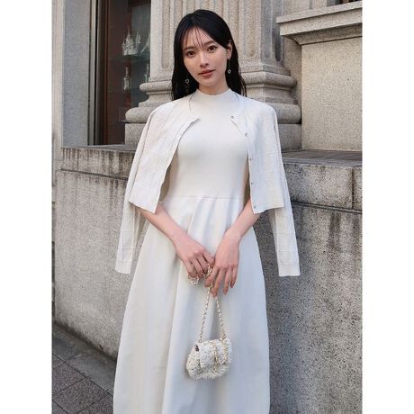 カーディガンのフロントには、さりげなく華やぎを添えるビジュー釦をあしらい、装いに上品なきらめきをプラスします。ワンピースの身頃はすっきりとしたリブがボディラインを美しく整え、ウエストには減らし目でギャザーの分量を調整。計算されたフィット&フレアーシルエットが、女性らしさをより一層引き立てます。
