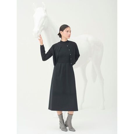 カーディガンのフロントには、さりげなく華やぎを添えるビジュー釦をあしらい、装いに上品なきらめきをプラスします。ワンピースの身頃はすっきりとしたリブがボディラインを美しく整え、ウエストには減らし目でギャザーの分量を調整。計算されたフィット&フレアーシルエットが、女性らしさをより一層引き立てます。