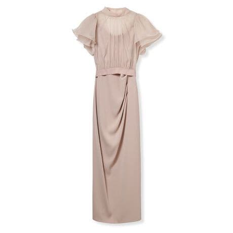 背中のさりげない肌見せと、二の腕をカバーするボリュームフリルが華やかさを引き立てます。