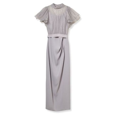 背中のさりげない肌見せと、二の腕をカバーするボリュームフリルが華やかさを引き立てます。