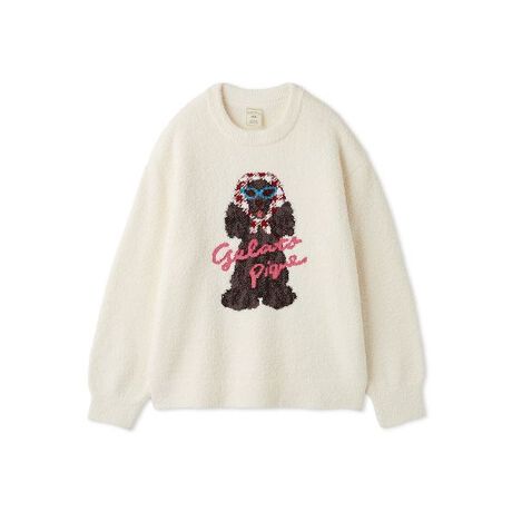 スカーフとサングラスでおしゃれしたコッカースパニエルを描いた、レトロポップな色使いのジャガードニットプルオーバー。ふんわりとしたあたたかみのあるニット素材を使用し、身幅と袖にゆとりを持たせたざっくりシルエットに仕上げました。犬種の毛色や筆記体ロゴの配色にもこだわり、トレンド感のあるスタイルをgelato piqueらしい遊び心で表現。ベースカラーは共通のオフホワイトで、スカーフはチェック柄レッド、スター柄ブルー、フラワー柄パープルの3種類をご用意しました。スカーフの色柄に合わせた同シリーズのロングパンツや小物とのコーディネートもおすすめです。