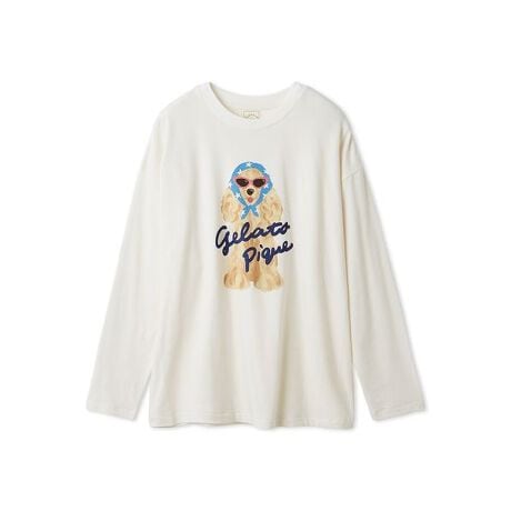 スカーフとサングラスでおしゃれしたコッカースパニエルを主役にした、遊び心たっぷりのプリント柄シリーズです。ドッグと手書き風ロゴをワンポイントでプリントしたロングTシャツは、1枚でもパーカ等のインナーとしても映えるデザイン。毛色ごとにスカーフの色柄が異なっているのがポイントです。色は首元につけたスカーフ柄がチェック柄のレッド、スター柄のブルー、フラワー柄のパープルの3種類。同シリーズのロングパンツや、同シリーズのスカーフドッグジャガードニットシリーズとコーディネートしてお楽しみください。