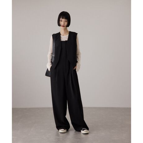 スッキリとした襟周りや、短丈のジレのバランスによりスタイルアップ効果あり。