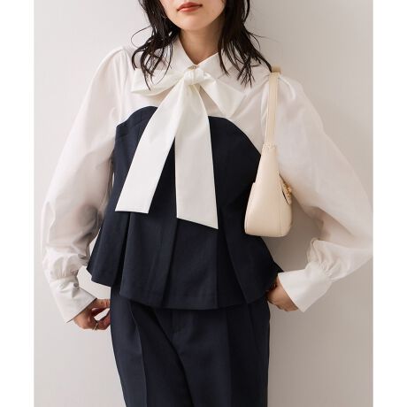 リボンボウタイと共布ベルトがついているので、シーンに合わせて違う見せ方が出来ます。着方としてはどちらか1つつけるのがおすすめです。