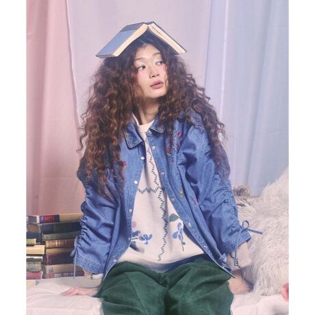春らしい明るいカラーが魅力のデニムシャツ。テーマの「物語の始まり」からインスピレーションを受けています。ゆったりとした身頃で快適な着心地を実現。袖には共紐を通したドロスト仕様で、袖丈とデザインの調節が可能です。パールのドットボタンを使用している点もデザインポイント。ホコモモラならではの豪華なお花刺繍が目を惹き、後ろの裾にはワンポイントで猟犬の刺繍を施した遊び心溢れるデザインに。ホコモモラのこだわりが詰まったオススメの一枚です。