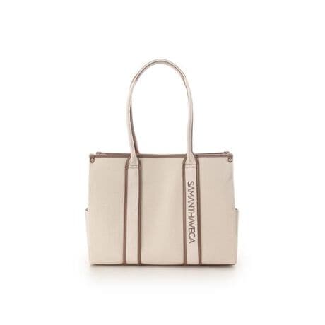 ◇SAMANTHAVEGA(サマンサベガ)の新色ロゴテープキャンバスA4トートバッグサマンサベガのロゴテープシリーズから新色が登場しました。トレンドなBOXフォルムのトートバッグです。ブランドロゴの入った持ち手がポイントです。軽量でデイリー使いしやすいおすすめバッグ。▽デザイン・BOXフォルム。キャンバスで軽量なデザイン。・持ち手のブランドロゴのテープがアクセント。・キャンバスと合皮の配色にこだわった組み合わせが可愛い。▽機能性・持ち手は合皮テープの加工で持ちやすく汚れにくい。・ざっくりとしたトートで荷物の出し入れがしやすい。・平たい持ち手なので負荷が少なく肩掛けがしやすい。【対応しているもの】・長財布・ペットボトル縦/横向き(500ml) ・A4サイズ
