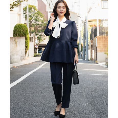 取り外し可能なボウタイにディテールコンシャスなコクーンペプラムが印象的なジャケットと定番人気のテーパードパンツをセットにした2点セットアップスーツです。