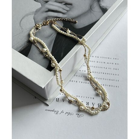 上品なパールと華奢なボールチェーンをミックスした、マルチレイヤードネックレス。