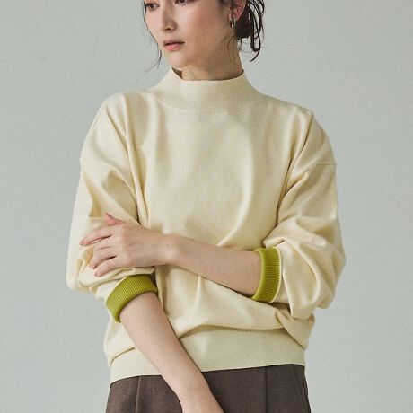 [型番:32513040000]*Detail*柔らかく軽い着心地が魅力のハイネックプルオーバー。袖を折り返すと見えるさりげないバイカラーが、装いに奥行きをプラスします。ゆるやかなシルエットで、デイリーに使いやすい一枚です。*Coordinate*シンプルなデニム合わせでも、袖口の配色がアクセントになり大人のこなれ感を演出します。きれいめパンツとあわせれば、オンシーンでも使える上品なスタイルに。