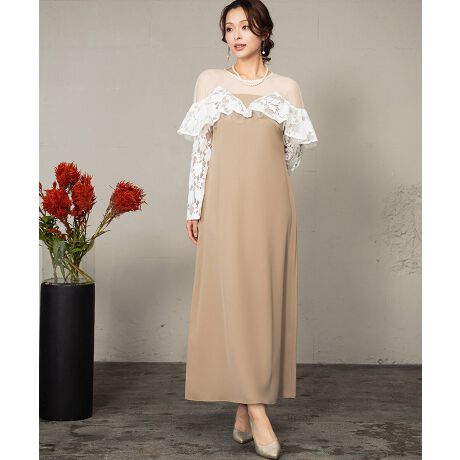 バストからスリーブへと流れるレースのラッフルが印象的な一着。