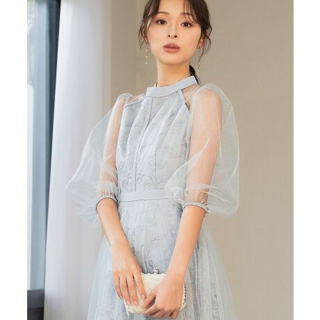 程良い透け感のあるオーガンジースリーブが二の腕をさりげなくカバーします。